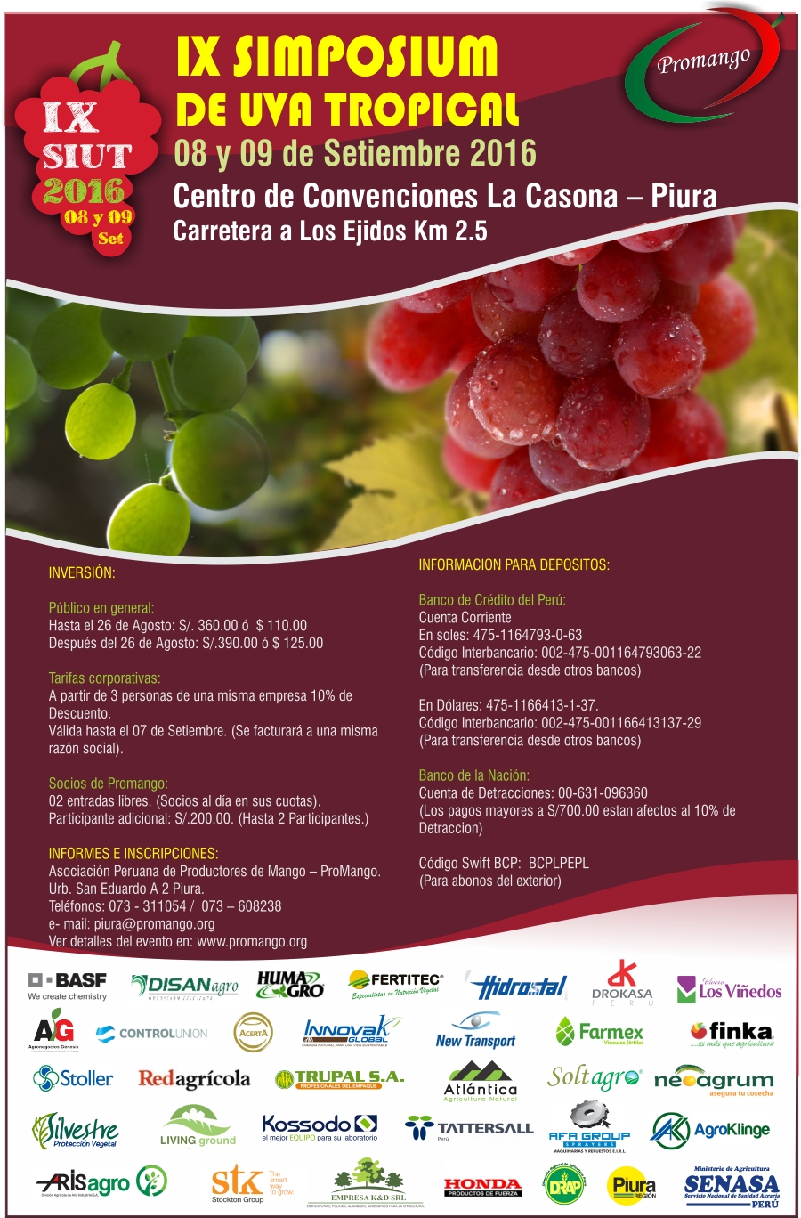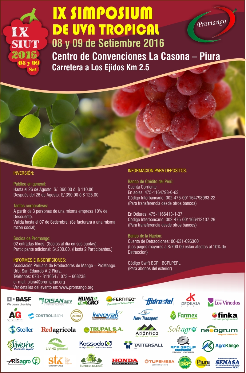 PresentaciónEn esta oportunidad presentamos el “IX SIMPOSIUM DE UVA TROPICAL 2016”, evento que organizamos hace siete años, con mucha acogida y éxito. El objetivo y finalidad del evento es adquirir e intercambiar conocimientos a todo nivel de este cultivo. Asimismo, es punto de encuentro para el inicio de planes de negocio entre los concurrentes.